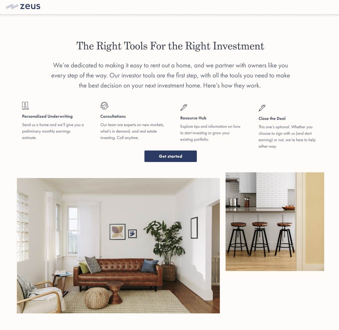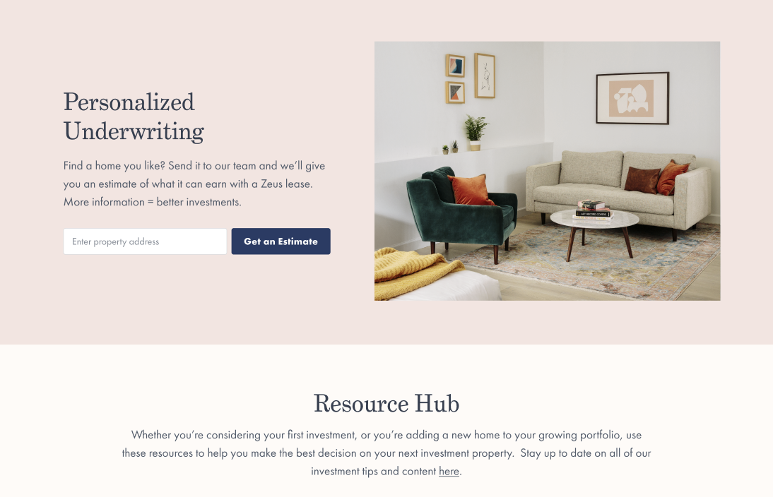 As lead writer for Zeus Living’s Investment Tool program, I developed landing page copy and transactional emails that clearly explained program offerings and guided homeowners toward requesting personalized underwriting. The copy balanced clarity, persuasion, and a strong call to action to drive engagement.
